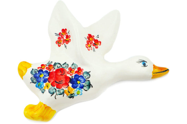 This faience Duck Figurine is create by the Fajans Wloclawek factory in Poland. Manufacturer item number H4166N. It is 1½" high and measures 7½" by 5½". The weight of this Duck Figurine is 0.6 lbs. It is part of the Little Flower Patch Collection.