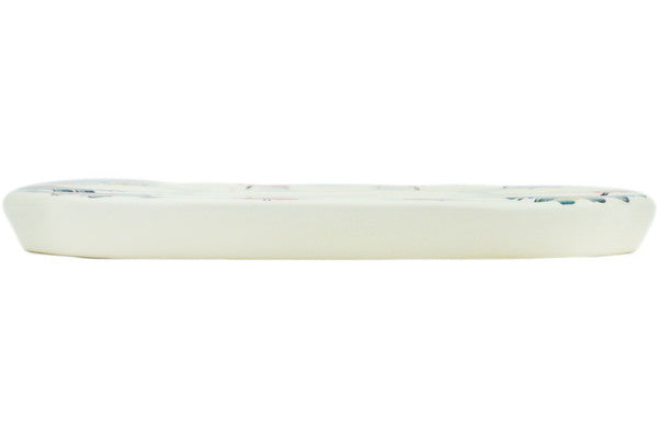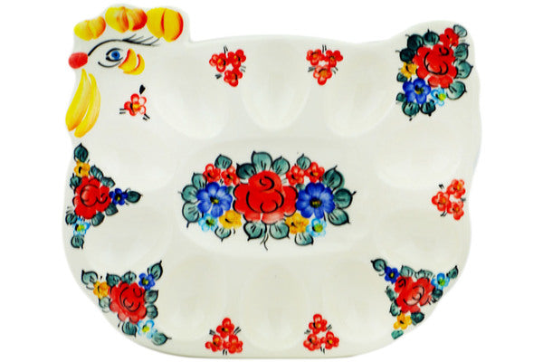 This faience Egg Plate is create by the Fajans Wloclawek factory in Poland. Manufacturer item number H2459N. It is 1" high and measures 9½" by 7½". The weight of this Egg Plate is 1.4 lbs. It is part of the Little Flower Patch Collection.