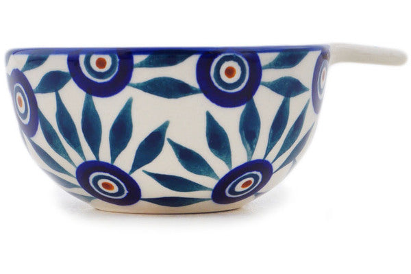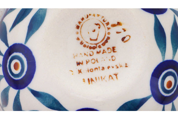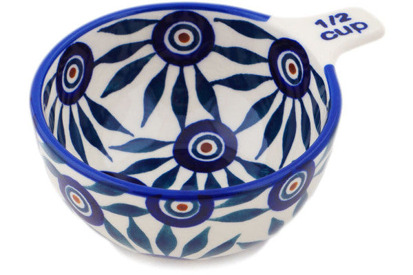 This Polish Pottery Measuring Cup is handmade and handpainted by the Manufaktura factory in Boleslawiec, Poland. Manufacturer item number H0065O. It is 1¾" high and measures 4½" by 3½". The capacity of this Measuring Cup is 3.99 oz (brimful) and it weighs 0.3 lbs. It is part of the Peacock Train Collection.