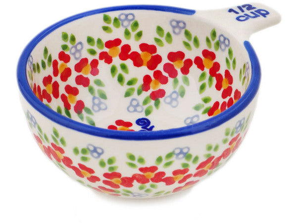 This Polish Pottery Measuring Cup is handmade and handpainted by the Manufaktura factory in Boleslawiec, Poland. Manufacturer item number H8287Q. It is 1¾" high and measures 4½" by 3½". The capacity of this Measuring Cup is 3.99 oz (brimful) and it weighs 0.3 lbs. It is part of the Red Chains Collection.