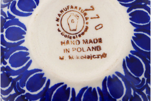 This Polish Pottery Measuring Cup is handmade and handpainted by the Manufaktura factory in Boleslawiec, Poland. Manufacturer item number H8241Q. It is 1¾" high and measures 4½" by 3½". The capacity of this Measuring Cup is 3.99 oz (brimful) and it weighs 0.3 lbs. It is part of the Retro Blue Tulips Collection.