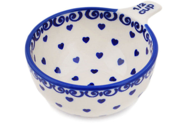 This Polish Pottery Measuring Cup is handmade and handpainted by the Manufaktura factory in Boleslawiec, Poland. Manufacturer item number H8249Q. It is 1¾" high and measures 4½" by 3½". The capacity of this Measuring Cup is 3.99 oz (brimful) and it weighs 0.3 lbs. It is part of the Sea Of Hearts Collection.