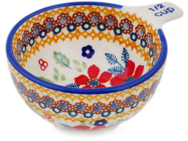 This Polish Pottery Measuring Cup is handmade and handpainted by the Manufaktura factory in Boleslawiec, Poland. Manufacturer item number H8237Q. It is 1¾" high and measures 4½" by 3½". The capacity of this Measuring Cup is 3.99 oz (brimful) and it weighs 0.3 lbs. It is part of the Summer Bouquet Collection.
