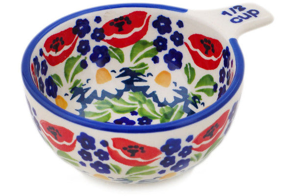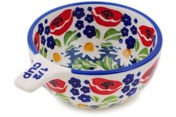 This Polish Pottery Measuring Cup is handmade and handpainted by the Manufaktura factory in Boleslawiec, Poland. Manufacturer item number H8248Q. It is 1¾" high and measures 4½" by 3½". The capacity of this Measuring Cup is 3.99 oz (brimful) and it weighs 0.3 lbs. It is part of the Wild Poppies Collection.