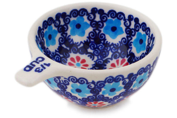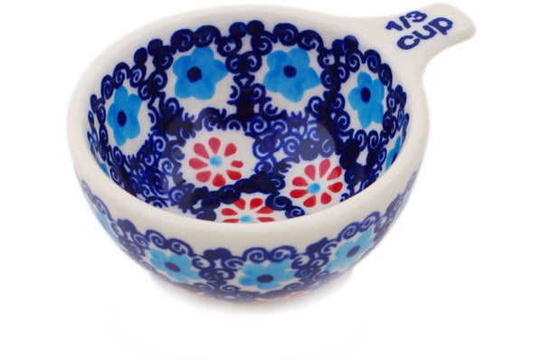 This Polish Pottery Measuring Cup is handmade and handpainted by the Manufaktura factory in Boleslawiec, Poland. Manufacturer item number H2722R. It is 1½" high and measures 3¾" by 3". The capacity of this Measuring Cup is 2.37 oz (brimful) and it weighs 0.2 lbs. It is part of the Floral Sea Collection.