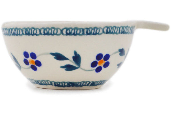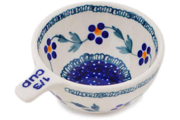 This Polish Pottery Measuring Cup is handmade and handpainted by the Manufaktura factory in Boleslawiec, Poland. Manufacturer item number H8212Q. It is 1½" high and measures 3¾" by 3". The capacity of this Measuring Cup is 2.37 oz (brimful) and it weighs 0.2 lbs. It is part of the Happy Day Collection.