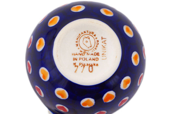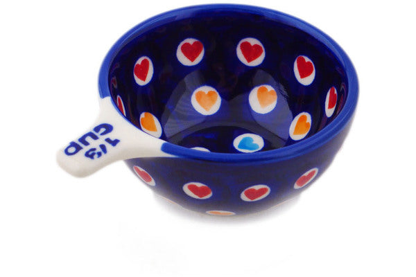 This Polish Pottery Measuring Cup is handmade and handpainted by the Manufaktura factory in Boleslawiec, Poland. Manufacturer item number H8201Q. It is 1½" high and measures 3¾" by 3". The capacity of this Measuring Cup is 2.37 oz (brimful) and it weighs 0.2 lbs. It is part of the Heart Disco Collection.