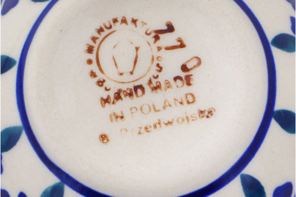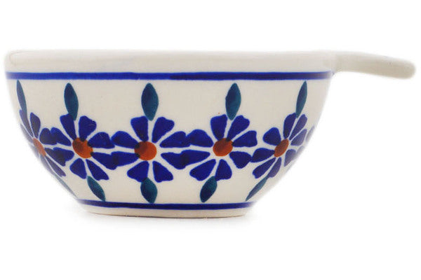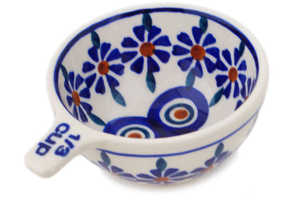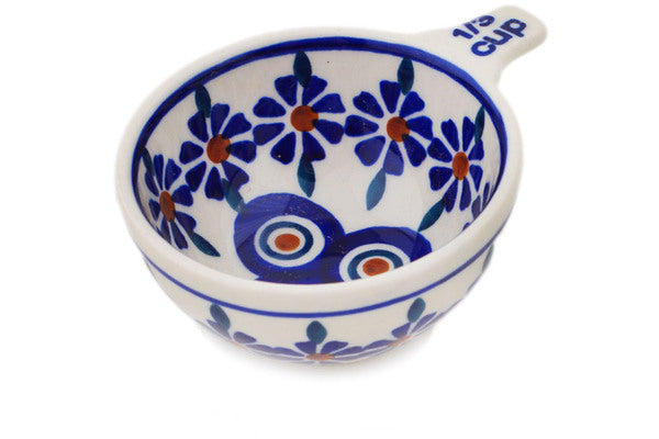 This Polish Pottery Measuring Cup is handmade and handpainted by the Manufaktura factory in Boleslawiec, Poland. Manufacturer item number H8204Q. It is 1½" high and measures 3¾" by 3". The capacity of this Measuring Cup is 2.37 oz (brimful) and it weighs 0.2 lbs. It is part of the Peacock Collection.