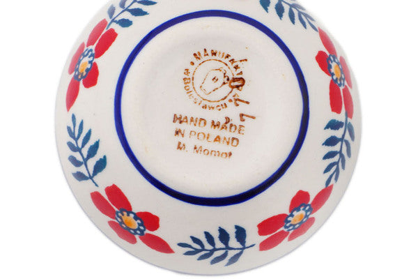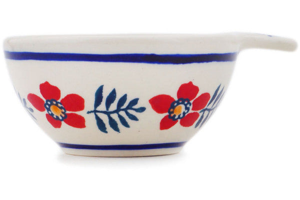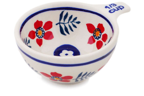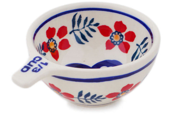 This Polish Pottery Measuring Cup is handmade and handpainted by the Manufaktura factory in Boleslawiec, Poland. Manufacturer item number H8211Q. It is 1½" high and measures 3¾" by 3". The capacity of this Measuring Cup is 2.37 oz (brimful) and it weighs 0.2 lbs. It is part of the Poppies And Ferns Collection.