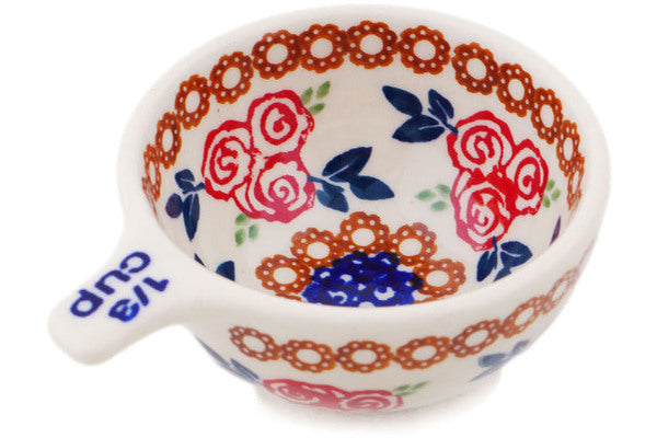 This Polish Pottery Measuring Cup is handmade and handpainted by the Manufaktura factory in Boleslawiec, Poland. Manufacturer item number H8216Q. It is 1½" high and measures 3¾" by 3". The capacity of this Measuring Cup is 2.37 oz (brimful) and it weighs 0.2 lbs. It is part of the Radiant Roses Collection.