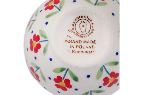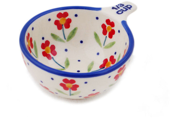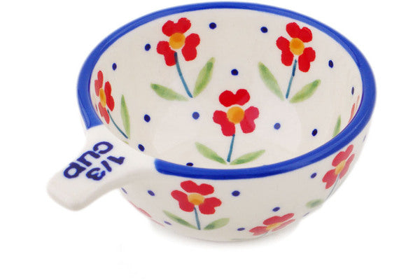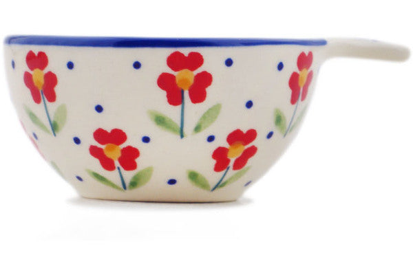 This Polish Pottery Measuring Cup is handmade and handpainted by the Manufaktura factory in Boleslawiec, Poland. Manufacturer item number H8207Q. It is 1½" high and measures 3¾" by 3". The capacity of this Measuring Cup is 2.37 oz (brimful) and it weighs 0.2 lbs. It is part of the Red Primrose Collection.