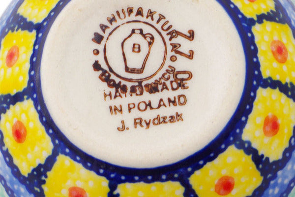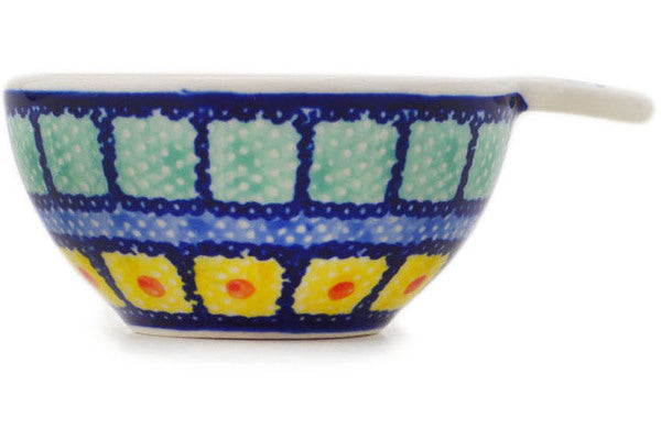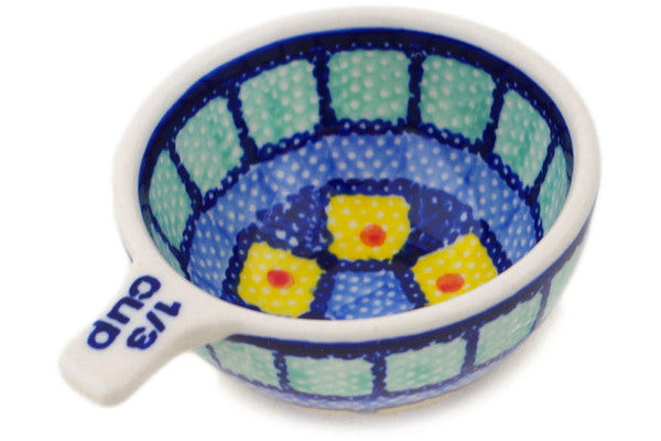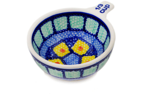 This Polish Pottery Measuring Cup is handmade and handpainted by the Manufaktura factory in Boleslawiec, Poland. Manufacturer item number H8202Q. It is 1½" high and measures 3¾" by 3". The capacity of this Measuring Cup is 2.37 oz (brimful) and it weighs 0.2 lbs. It is part of the Stained Glass Collection.