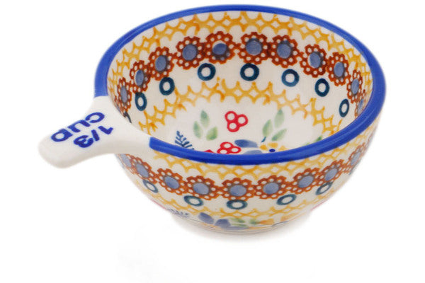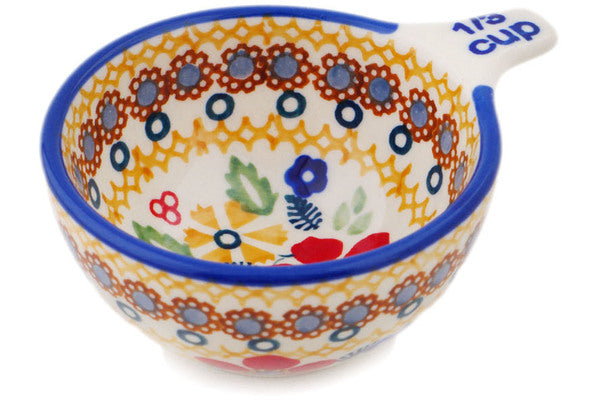 This Polish Pottery Measuring Cup is handmade and handpainted by the Manufaktura factory in Boleslawiec, Poland. Manufacturer item number H8210Q. It is 1½" high and measures 3¾" by 3". The capacity of this Measuring Cup is 2.37 oz (brimful) and it weighs 0.2 lbs. It is part of the Summer Bouquet Collection.