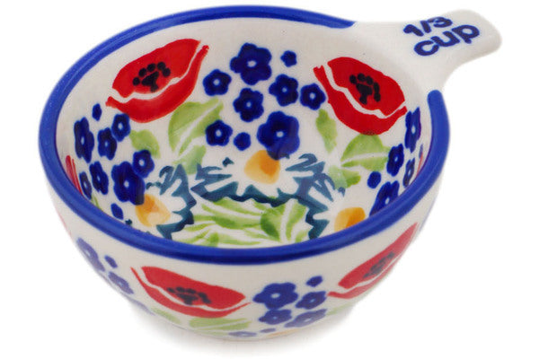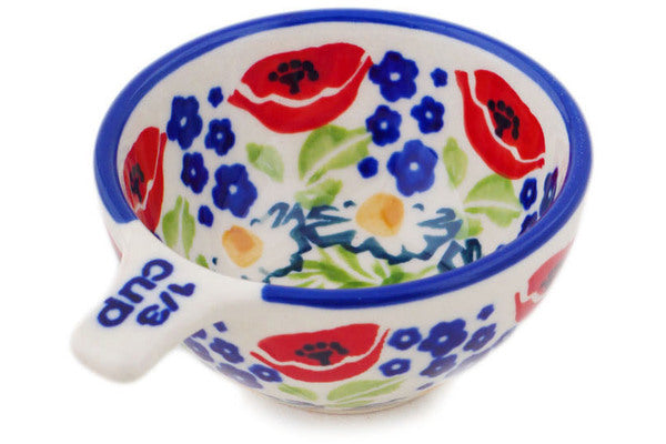This Polish Pottery Measuring Cup is handmade and handpainted by the Manufaktura factory in Boleslawiec, Poland. Manufacturer item number H8221Q. It is 1½" high and measures 3¾" by 3". The capacity of this Measuring Cup is 2.37 oz (brimful) and it weighs 0.2 lbs. It is part of the Wild Poppies Collection.