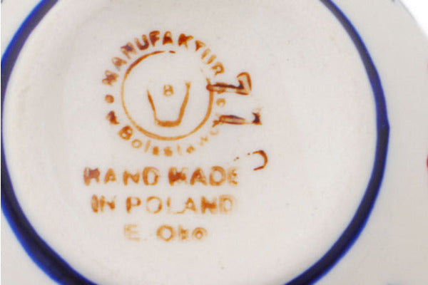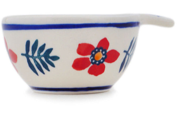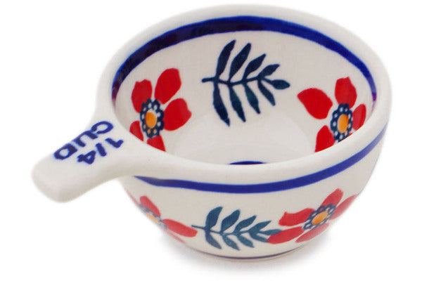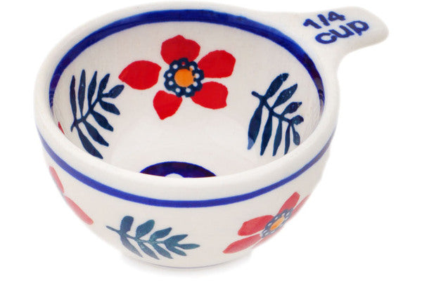 This Polish Pottery Measuring Cup is handmade and handpainted by the Manufaktura factory in Boleslawiec, Poland. Manufacturer item number H8184Q. It is 1½" high and measures 3½" by 2½". The capacity of this Measuring Cup is 1.83 oz (brimful) and it weighs 0.2 lbs. It is part of the Poppies And Ferns Collection.