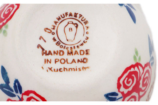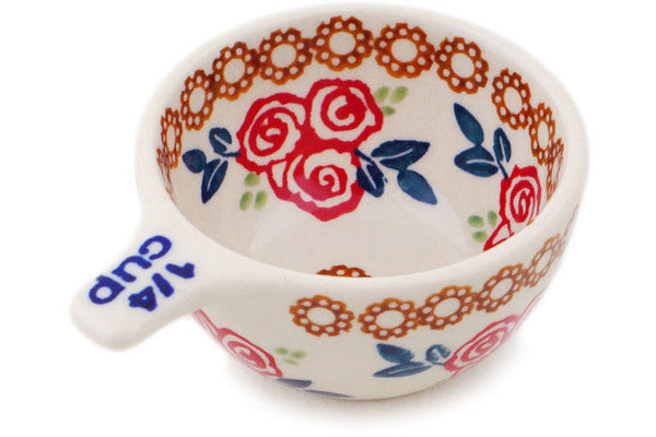 This Polish Pottery Measuring Cup is handmade and handpainted by the Manufaktura factory in Boleslawiec, Poland. Manufacturer item number H8189Q. It is 1½" high and measures 3½" by 2½". The capacity of this Measuring Cup is 1.83 oz (brimful) and it weighs 0.2 lbs. It is part of the Radiant Roses Collection.