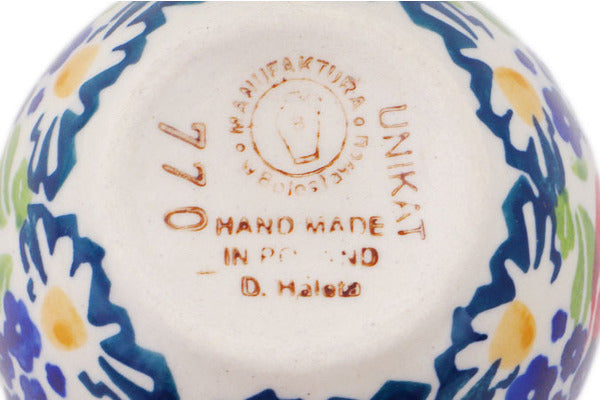 This is a Polish pottery Unikat (Signature) Measuring Cup, which means that it has been hand painted with both sponges and brushes and it is signed by the artist who painted it. Unikat pieces are the most intricate works of art. Larger Unikat items take hours of very careful work to finish.