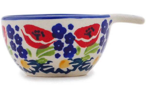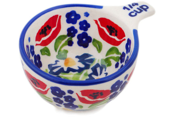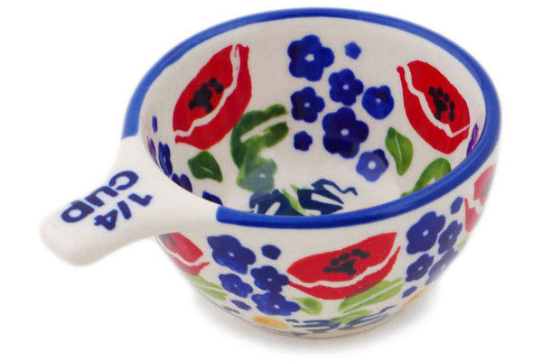 This Polish Pottery Measuring Cup is handmade and handpainted by the Manufaktura factory in Boleslawiec, Poland. Manufacturer item number H8194Q. It is 1½" high and measures 3½" by 2½". The capacity of this Measuring Cup is 1.83 oz (brimful) and it weighs 0.2 lbs. It is part of the Wild Poppies Collection.