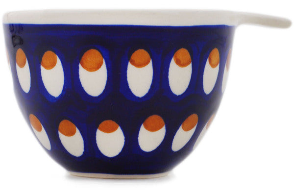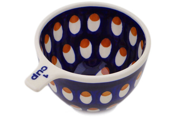 This Polish Pottery Measuring Cup is handmade and handpainted by the Manufaktura factory in Boleslawiec, Poland. Manufacturer item number H8257Q. It is 2½" high and measures 4¾" by 3¾". The capacity of this Measuring Cup is 8.39 oz (brimful) and it weighs 0.4 lbs. It is part of the American Peacock Collection.