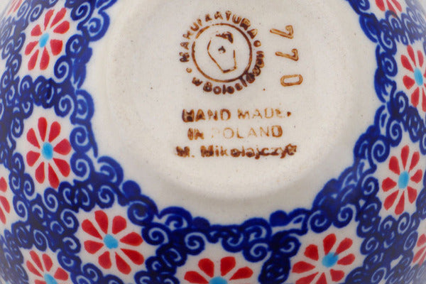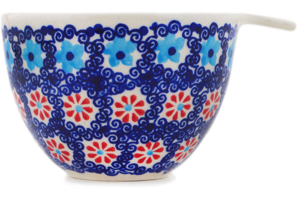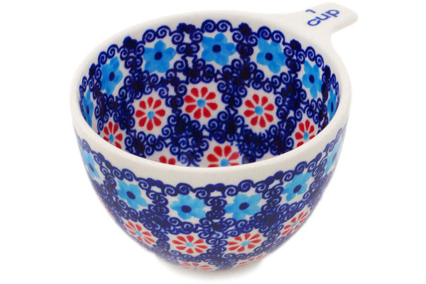 This Polish Pottery Measuring Cup is handmade and handpainted by the Manufaktura factory in Boleslawiec, Poland. Manufacturer item number H4487R. It is 2½" high and measures 4¾" by 3¾". The capacity of this Measuring Cup is 8.39 oz (brimful) and it weighs 0.4 lbs. It is part of the Floral Sea Collection.