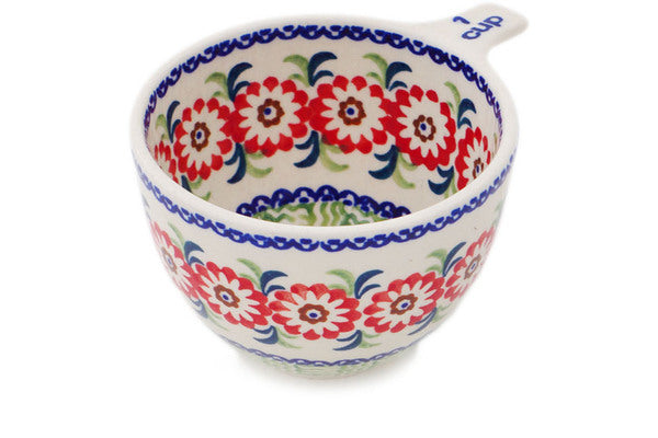 This Polish Pottery Measuring Cup is handmade and handpainted by the Manufaktura factory in Boleslawiec, Poland. Manufacturer item number H8273Q. It is 2½" high and measures 4¾" by 3¾". The capacity of this Measuring Cup is 8.39 oz (brimful) and it weighs 0.4 lbs. It is part of the Looking Daisy Collection.