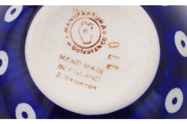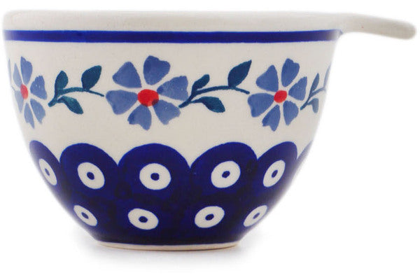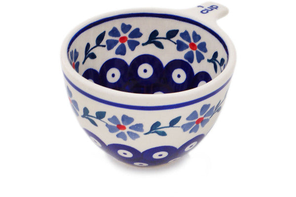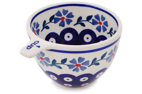 This Polish Pottery Measuring Cup is handmade and handpainted by the Manufaktura factory in Boleslawiec, Poland. Manufacturer item number H7255O. It is 2½" high and measures 4¾" by 3¾". The capacity of this Measuring Cup is 8.39 oz (brimful) and it weighs 0.4 lbs. It is part of the Peacock Forget-Me-Not Collection.