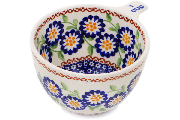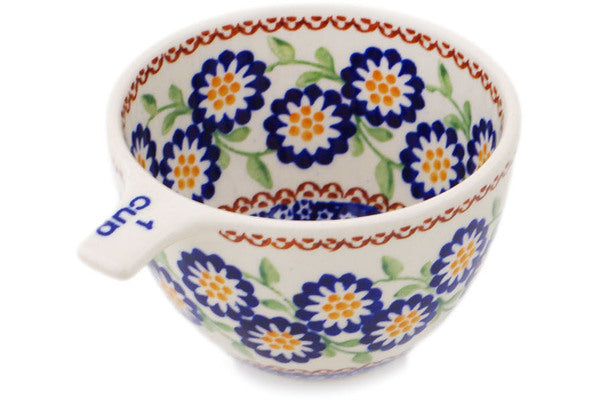 This Polish Pottery Measuring Cup is handmade and handpainted by the Manufaktura factory in Boleslawiec, Poland. Manufacturer item number H8272Q. It is 2½" high and measures 4¾" by 3¾". The capacity of this Measuring Cup is 8.39 oz (brimful) and it weighs 0.4 lbs. It is part of the Spring Yellow Posey Collection.