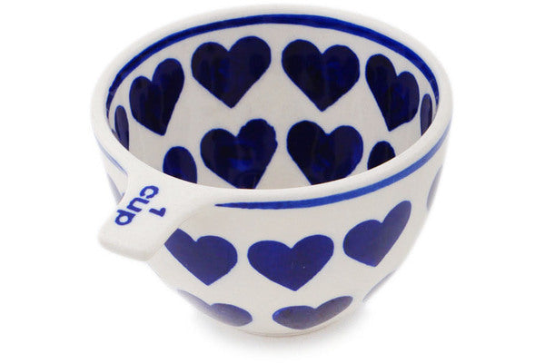 This Polish Pottery Measuring Cup is handmade and handpainted by the Manufaktura factory in Boleslawiec, Poland. Manufacturer item number H8279Q. It is 2½" high and measures 4¾" by 3¾". The capacity of this Measuring Cup is 8.39 oz (brimful) and it weighs 0.4 lbs. It is part of the Surrounded By Love Collection.