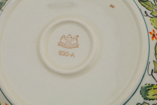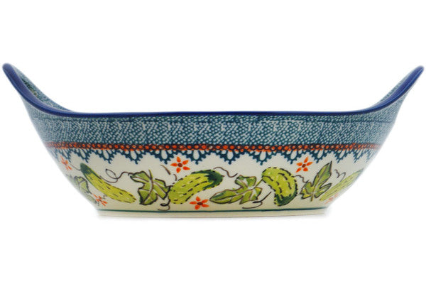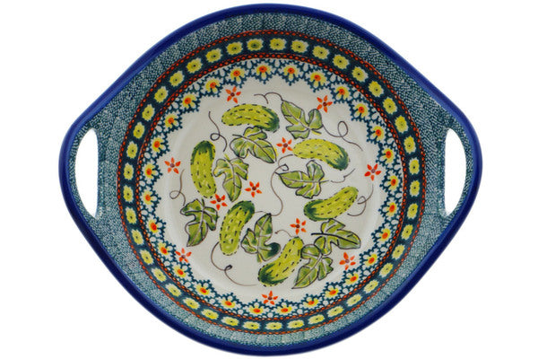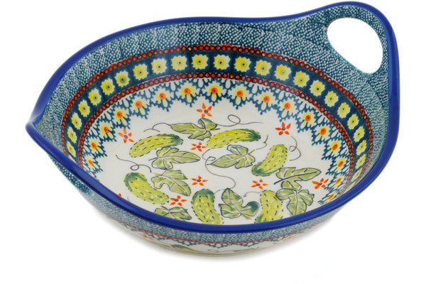 This Polish Pottery Bowl with Handles is handmade and handpainted by the Zaklady Ceramiczne factory in Boleslawiec, Poland. Manufacturer item number H1448N. It is 3¼" high and measures 9¾" by 8¾". The capacity of this Bowl with Handles is 32.16 oz (brimful) and it weighs 1.5 lbs. It is part of the Cucumber Patch Collection.