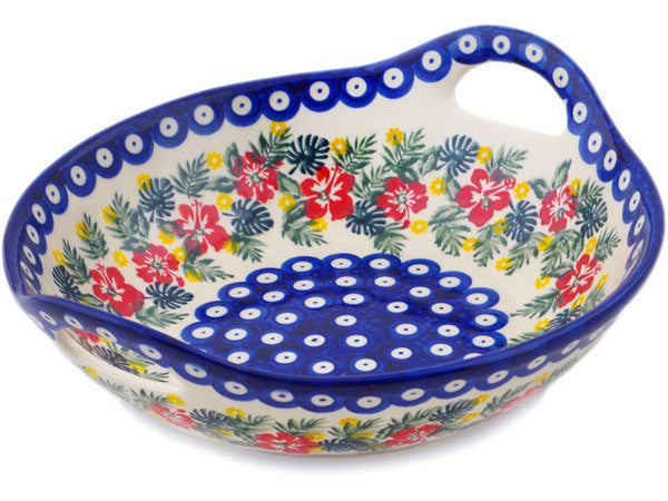This Polish Pottery Bowl with Handles is handmade and handpainted by the Ceramika Bona factory in Boleslawiec, Poland. Manufacturer item number H1807P. It is 3¼" high and measures 10¼" by 10". The capacity of this Bowl with Handles is 43.96 oz (brimful) and it weighs 2.4 lbs. It is part of the Tropical Peacock Collection.