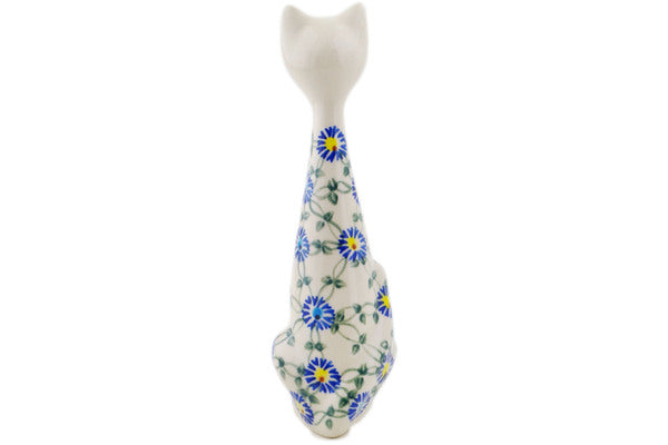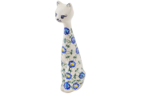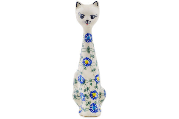 This Polish Pottery Cat Figurine is handmade and handpainted by the Ceramika Bona factory in Boleslawiec, Poland. Manufacturer item number H2234R. It is 9¾" high and measures 3¾" by 3¼". The weight of this Cat Figurine is 0.9 lbs. It is part of the Blue Thistle Beauty Collection.