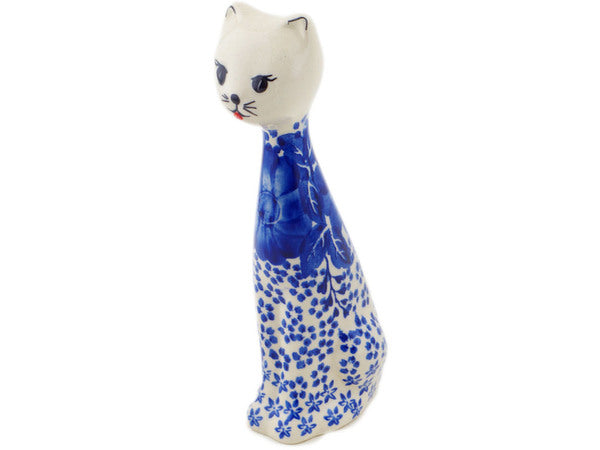 This Polish Pottery Cat Figurine is handmade and handpainted by the Ceramika Bona factory in Boleslawiec, Poland. Manufacturer item number H5692P. It is 9¾" high and measures 3¾" by 3¼". The weight of this Cat Figurine is 0.9 lbs. It is part of the Cobalt Fantasy Collection.