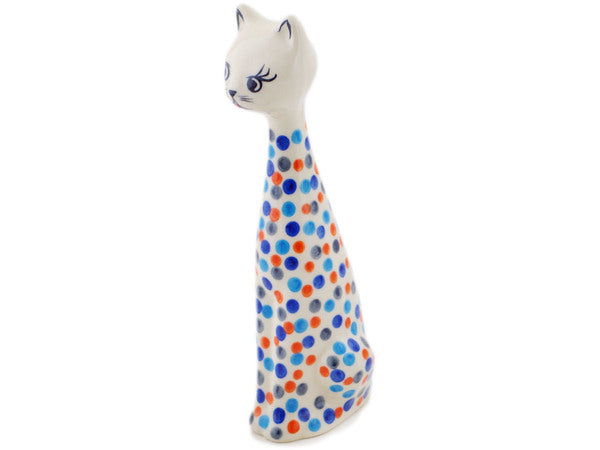 This Polish Pottery Cat Figurine is handmade and handpainted by the Ceramika Bona factory in Boleslawiec, Poland. Manufacturer item number H2064R. It is 9¾" high and measures 3¾" by 3¼". The weight of this Cat Figurine is 0.9 lbs. It is part of the Polka Dot Frenzy Collection.