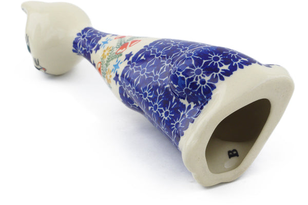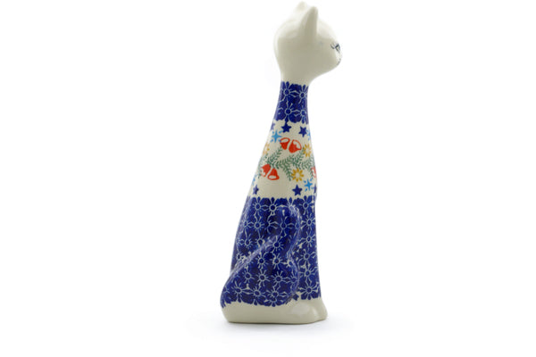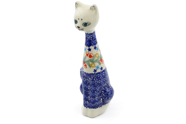 This Polish Pottery Cat Figurine is handmade and handpainted by the Ceramika Bona factory in Boleslawiec, Poland. Manufacturer item number H1251J. It is 9¾" high and measures 3¾" by 3¼". The weight of this Cat Figurine is 0.9 lbs. It is part of the Wreath Of Bells Collection.