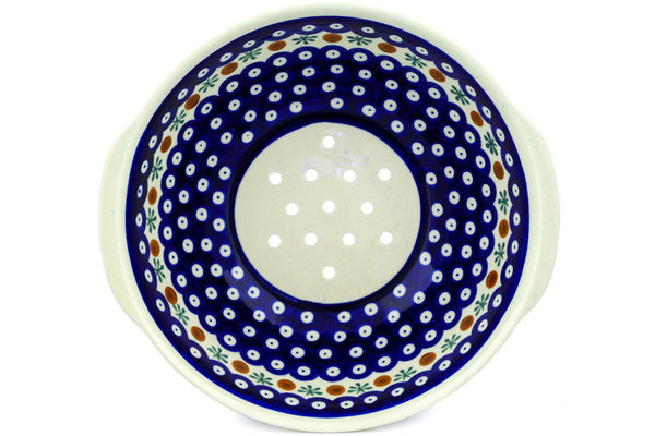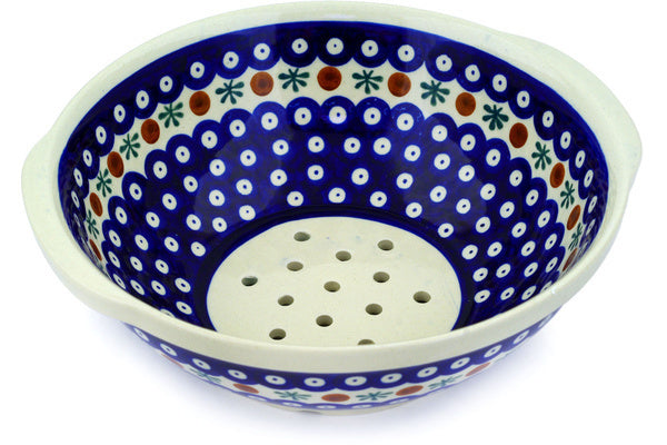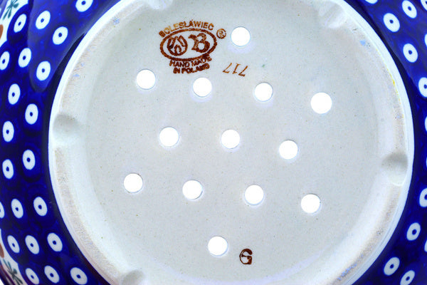 This Polish Pottery Colander is handmade and handpainted by the Zaklady Ceramiczne factory in Boleslawiec, Poland. Manufacturer item number H8409C. It is 3½" high and measures 10" by 9½". The weight of this Colander is 2.7 lbs. It is part of the Mosquito Collection.