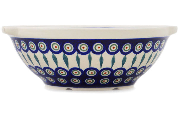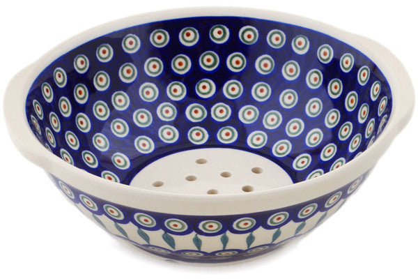 This Polish Pottery Colander is handmade and handpainted by the Zaklady Ceramiczne factory in Boleslawiec, Poland. Manufacturer item number H0361D. It is 3½" high and measures 10" by 9½". The weight of this Colander is 2.7 lbs. It is part of the Peacock Leaves Collection.
