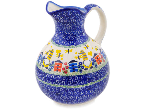 This Polish Pottery Pitcher is handmade and handpainted by the Ceramika Nina factory in Boleslawiec, Poland. Manufacturer item number H3195P. It is 9¾" high and measures 8½" by 7". The capacity of this Pitcher is 83.18 oz (brimful) and it weighs 3.6 lbs. It is part of the Beekeeper Gnome Collection.