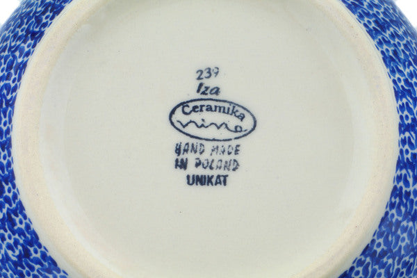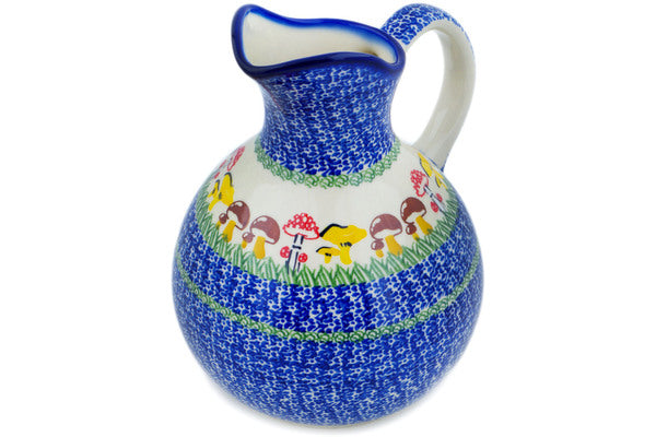 This Polish Pottery Pitcher is handmade and handpainted by the Ceramika Nina factory in Boleslawiec, Poland. Manufacturer item number H2599P. It is 9¾" high and measures 8½" by 7". The capacity of this Pitcher is 83.18 oz (brimful) and it weighs 3.6 lbs. It is part of the Wild Mushroom Picking Collection.