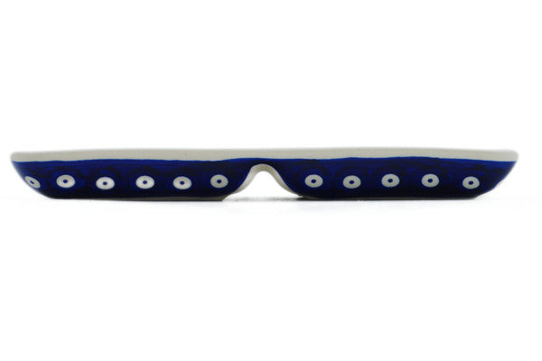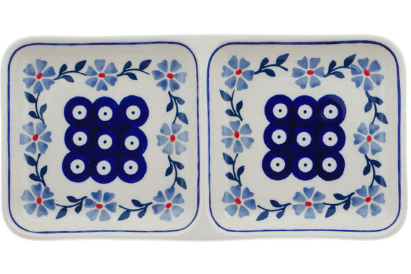 This Polish Pottery Divided Dish is handmade and handpainted by the Manufaktura factory in Boleslawiec, Poland. Manufacturer item number H7372O. It is 1" high and measures 9¾" by 5". The weight of this Divided Dish is 1.2 lbs. It is part of the Peacock Forget-Me-Not Collection.