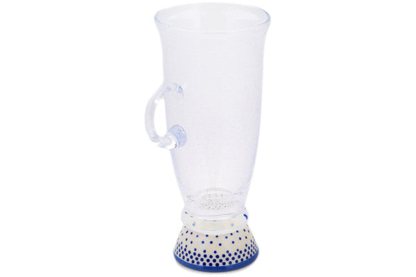 This Polish Pottery Cappuccino Glass is handmade and handpainted by the Manufaktura factory in Boleslawiec, Poland. Manufacturer item number H4540Q. It is 6¾" high and measures 3¾" by 3". The capacity of this Cappuccino Glass is 9.98 oz (brimful) and it weighs 0.7 lbs. It is part of the Misty Blue Collection.