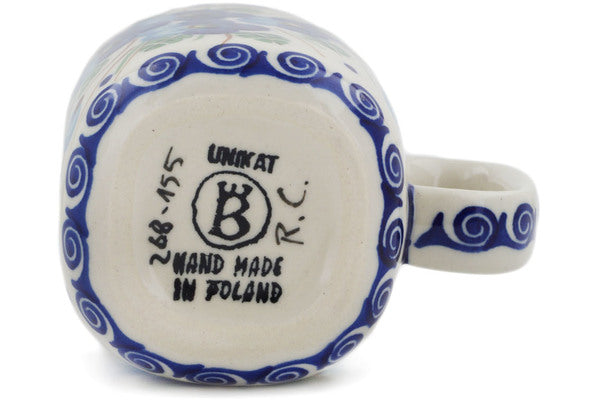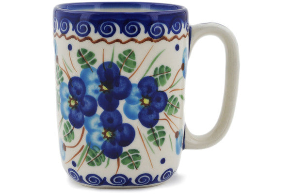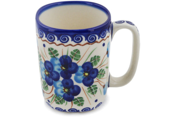 This Polish Pottery Mug is handmade and handpainted by the Ceramika Bona factory in Boleslawiec, Poland. Manufacturer item number H7270K. It is 3¾" high and measures 4¼" by 3". The capacity of this Mug is 9.60 oz (brimful) and it weighs 0.7 lbs. It is part of the Blue Pansy Collection.