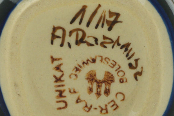This is a Polish pottery Unikat (Signature) Mug, which means that it has been hand painted with both sponges and brushes and it is signed by the artist who painted it. Unikat pieces are the most intricate works of art. Larger Unikat items take hours of very careful work to finish.