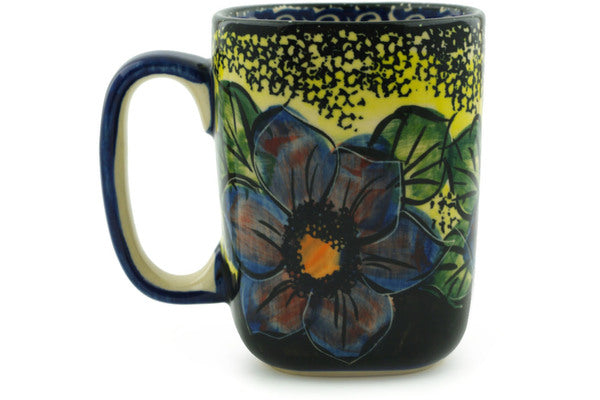This Polish Pottery Mug is handmade and handpainted by the Cer-Raf factory in Boleslawiec, Poland. Manufacturer item number H6164I. It is 3¾" high and measures 4¾" by 3½". The capacity of this Mug is 10.48 oz (brimful) and it weighs 0.6 lbs. It is part of the Midnight Glow Collection.