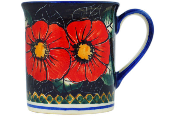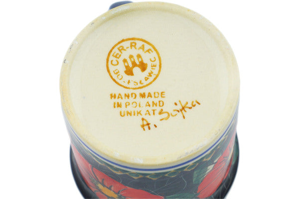This Polish Pottery Mug is handmade and handpainted by the Cer-Raf factory in Boleslawiec, Poland. Manufacturer item number H1446F. It is 3¾" high and measures 4¾" by 3½". The capacity of this Mug is 10.48 oz (brimful) and it weighs 0.6 lbs. It is part of the Poppy Passion Collection.