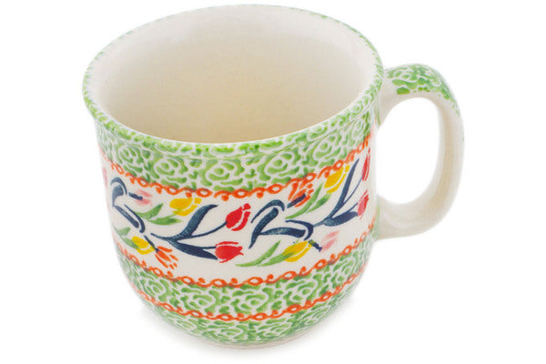 This Polish Pottery Mug is handmade and handpainted by the Ceramika Bona factory in Boleslawiec, Poland. Manufacturer item number H3684P. It is 3¼" high and measures 4½" by 3½". The capacity of this Mug is 10.14 oz (brimful) and it weighs 0.6 lbs. It is part of the Tulip Ring Collection.