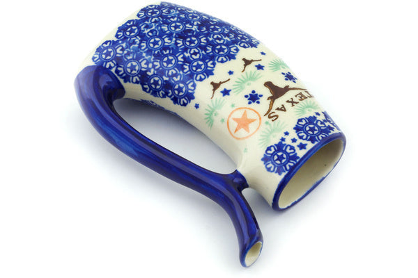 This Polish Pottery Sipper Mug is handmade and handpainted by the Ceramika Bona factory in Boleslawiec, Poland. Manufacturer item number H8308H. It is 6¼" high and measures 4¾" by 1½". The capacity of this Sipper Mug is 10.14 oz (brimful) and it weighs 0.6 lbs. It is part of the Texas State Collection.