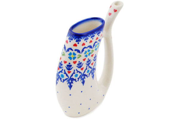 This Polish Pottery Sipper Mug is handmade and handpainted by the Ceramika Bona factory in Boleslawiec, Poland. Manufacturer item number H0155Q. It is 6¼" high and measures 4¾" by 1½". The capacity of this Sipper Mug is 10.14 oz (brimful) and it weighs 0.6 lbs. It is part of the Graphic Armor Collection.
