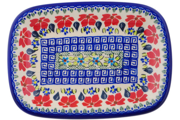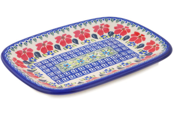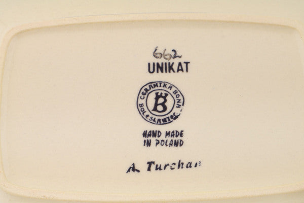 This Polish Pottery Platter is handmade and handpainted by the Ceramika Bona factory in Boleslawiec, Poland. Manufacturer item number H3011Q. It is ¾" high and measures 9¾" by 7". The weight of this Platter is 1.4 lbs. It is part of the Grecian Fields Collection.