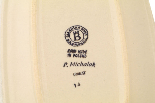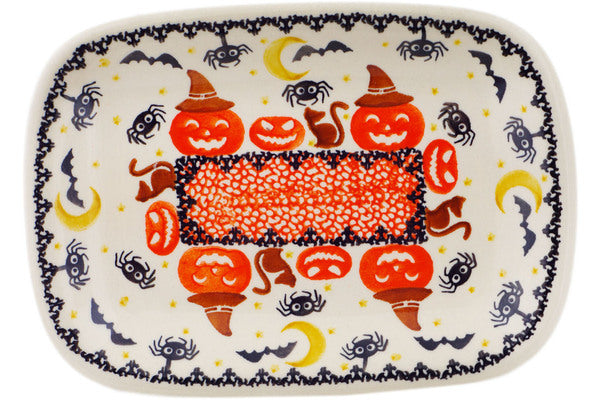 This Polish Pottery Platter is handmade and handpainted by the Ceramika Bona factory in Boleslawiec, Poland. Manufacturer item number H2570P. It is ¾" high and measures 9¾" by 7". The weight of this Platter is 1.4 lbs. It is part of the Halloween Spooky Pumpkin Collection.