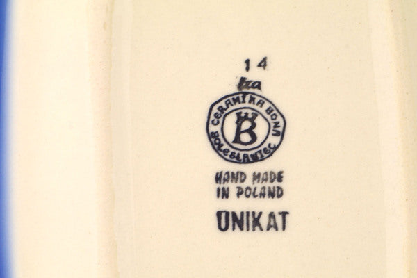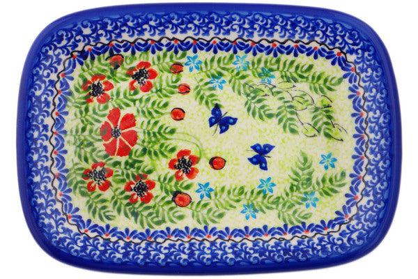 This Polish Pottery Platter is handmade and handpainted by the Ceramika Bona factory in Boleslawiec, Poland. Manufacturer item number H8720Q. It is ¾" high and measures 9¾" by 7". The weight of this Platter is 1.4 lbs. It is part of the Metamorphosis Collection.